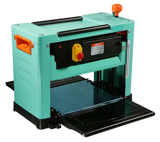 - Мощный переносной станок для строгания деревянных заготовок шириной до 330мм с двумя удлинителями стола, оснащенными специальными роликами для облегчения подачи габаритных заготовок и их поддержки на входе и выходе.
