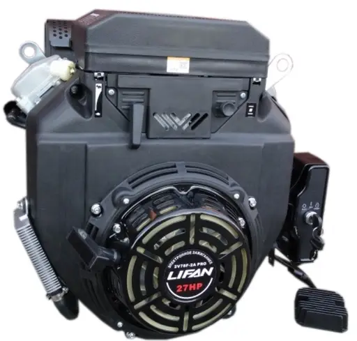Бензиновый двигатель Lifan 2V78F-2A PRO 27 л.с. устанавливается на минитрактора, снегоболотоходы, гидроустановки и другую технику. Данная модель имеет двухкамерный карбюратор, при этом система впрыска - распределенная. Отверстия для установки идентичны с предыдущей по мощности моделью (24 л.с.). Одной из особенностей двигателя является подключаемый аккумулятор. При его отсутствии двигатель не будет работать из-за электронного клапана.. Установлена катушка освещения в 20А, что позволяет подключать электрооборудование до 240 Вт. Присутствует датчик давления масла и масляный радиатор. Установлена усовершенствованная катушка зажигания, и высоковольтные провода имеют новую силиконовую изоляцию. Отсутствие топливного бака позволяет подключить двигатель к имеющейся топливной системе.