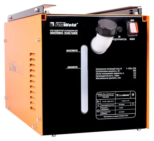 Внешний блок жидкостного охлаждения предназначен для работы с линейкой полуавтоматов Foxweld Invermig 350E и Invermig 500E. Блок жидкостного охлаждения применяется для охлаждения сварочной горелки MIG/MAG или TIG - сварки, защищает ее от прогорания и увеличивает срок службы горелки и её сменных элементов.