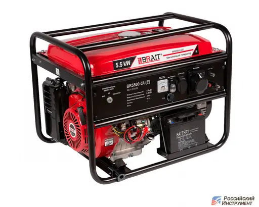 BR-5500CU(Е) оснащен четырехтактным бензиновым двигателем, работающем на АИ-92 бензине. Он обладает мощностью 13 лошадиных сил и имеет воздушное охлаждение. Емкость бака для топлива - 25 литров. Полной заправки будет достаточно на девять часов беспрерывной работы при среднем уровне загрузки. На корпусе генератора размещены две обычные розетки 32А и 16А. Медная обмотка увеличивает срок службы генератора. контролировать напряжение можно посредством простого вольтметра, находящегося на передней панели корпуса.