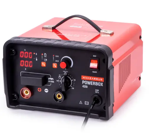 Профессиональное инверторное пуско-зарядное устройство KVAZARRUS PowerBox 420i современное и инновационное устройство, которое работает от однофазной сети 230 В / 50 Гц и подключается к стандартной розетке 16 А. Представляет собой устройство гибридного типа и предназначается для зарядки 12 и 24 В свинцово-кислотных аккумуляторных батарей c жидким электролитом (wet) емкостью от 40 до 1000 Ач.