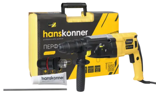 Hanskonner HRH0828REС – универсальный трехрежимный перфоратор. Имеет классическую горизонтальную компоновку с продолговатым узким корпусом и небольшую массу, за счет чего максимально удобен при высотных работах, а также при эксплуатации в условиях с трудным доступом. Главная отличительная черта модели Hanskonner HRH0828REС – возможность быстрой смены патронов под разные типы используемой оснастки: одним движением пользователь может заменить патрон под оснастку с типом хвостовика SDS Plus, на аналогичный, рассчитанный под цилиндрический хвостовик и обратно. Модель оснащена двигателем мощностью 850 Вт и усиленным вакуумно-компрессионным механизмом, развивающим энергию удара – 3.2 Дж – это позволяет уверенно бурить отверстия диаметром до 28 мм в материалах различной твердости, включая кирпичную кладку, камень и бетон, а также использовать корончатые сверла больших диаметров (до 68 мм). Универсальность применения обеспечивают три режима работы – в зависимости от конкретной задачи пользователь выбирает нужный: сверление, сверление с ударом, либо режим удара. Смена режимов происходит поворотом специального переключателя.