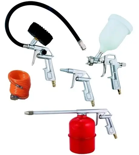 Набор пневмоинструмента 5 в 1 НПИ-01: шланг спиральный 5м, пистолет обдувочный, пистолет для подкачки колес, краскопульт с верхним бачком сопло d-1,2, пистолет для вязких жидкостей.