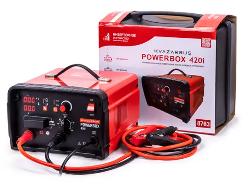 Профессиональное инверторное пуско-зарядное устройство KVAZARRUS PowerBox 420i современное и инновационное устройство, которое работает от однофазной сети 230 В / 50 Гц и подключается к стандартной розетке 16 А. Представляет собой устройство гибридного типа и предназначается для зарядки 12 и 24 В свинцово-кислотных аккумуляторных батарей c жидким электролитом (wet) емкостью от 40 до 1000 Ач.