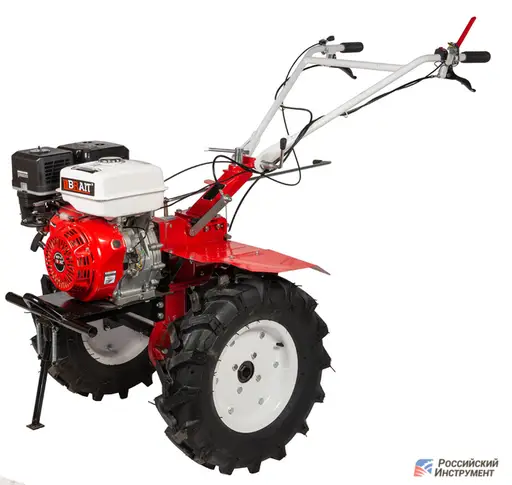 Двигатель этого агрегата имеет мощность 9 лошадиных сил, произведён по спецификации знаменитого завода LIFAN. Топливный бак объёмом 6 литров и экономичный расход топлива, дают возможность долгое время работать без дозаправки. Высококачественная коробка передач имеет 2 скорости вперёд и 1 назад. Аппарат оснащён мощным, цельнолитым чугунным редуктором, созданным специально для эксплуатации в жёстких условиях на тяжёлых грунтах и для обработки целины. Зубчатая передача, которая сообщает крутящий момент двигателя колёсам и фрезам, отличается надёжностью и долговечностью. Сцепка мотоблока изготовлена с большим запасом прочности и позволяет работать не только с сошником, плугом или окучником, но и с телегой.