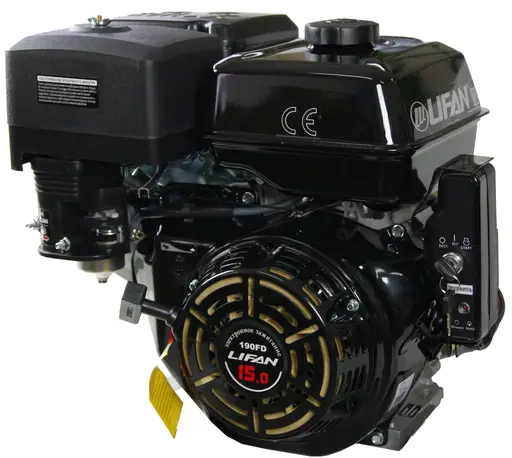 Двигатели Лифан 190FD серии Horizontal до 15 кВт отличаются следующими конструктивными особенностями: топливный кран, позволяющий перекрывать подачу топлива в карбюратор при транспортировке; чугунная гильза цилиндра, увеличивающая моторесурс двигателя. Двигатель Lifan 190FD широко используется в различных областях, таких как строительство, сельское хозяйство, производство и другие сферы деятельности, где требуется надёжное и эффективное оборудование. Характеристики: мощность: до 15 л. с.; расположение вала: горизонтальное; * диаметр вала: 25 мм; рабочий объём: 420 см³; ёмкость топливного бака: 6,5 л; объём масла в картере: 1,1 л; * тип запуска: ручной и электростартер. Электростартер на 12 вольт позволяет повысить комфорт пользования, мощная катушка освещения позволяет делегировать 12 вольтовое напряжение на оборудование, выводить освещение .