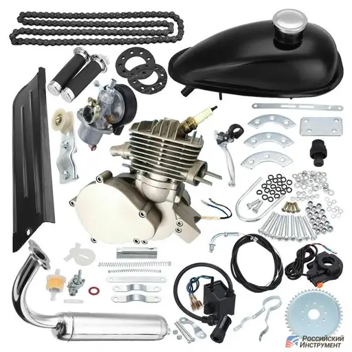Веломотор F100 с одноцилиндровым, двухтактным двигателем. С помощью комплекта F100 вы сможете самостоятельно построить велосипед с мотором на базе обычного велосипеда.