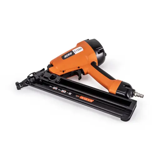 Финишный нейлер или пневматический гвоздезабивной пистолет AERO C1564 - мощный профессиональный инструмент для надежного забивания гвоздей в любую породу дерева. Используется для быстрой и надежного скрепления листовых материалов, таких как паркетная доска, фанера, ДВП, гипсокартон. Рекомендован к применению при выполнении следующих работ: изготовление дверей и окон из дерева, укладка паркета, обшивочные и отделочные работы. Устройство позволяет регулировать глубину забивания гвоздей. Контактный предохранитель защитит от случайного выстрела. Удобный спусковой крючок обеспечит быструю работу. Инструмент использует финишные гвозди 15GA (тип DA) длиной от 32 мм до 64 мм с углом наклона 34°. Поворотный дефлектор, находящийся на крышке инструмента, позволит выбрать наиболее комфортное для пользователя и окружающих направление выхода воздуха. Эргономичная прорезиненная рукоятка снижает усталость и дискомфорт во время работы. Для работы инструмента необходим воздушный компрессор и подготовленная воздушная магистраль. Рабочее давление AERO C1564 составляет 4,8 - 8,0 бар. Для быстроты и удобства подключения оснащен интегрированным быстросъемным разъемом типа Rapid M "папа".